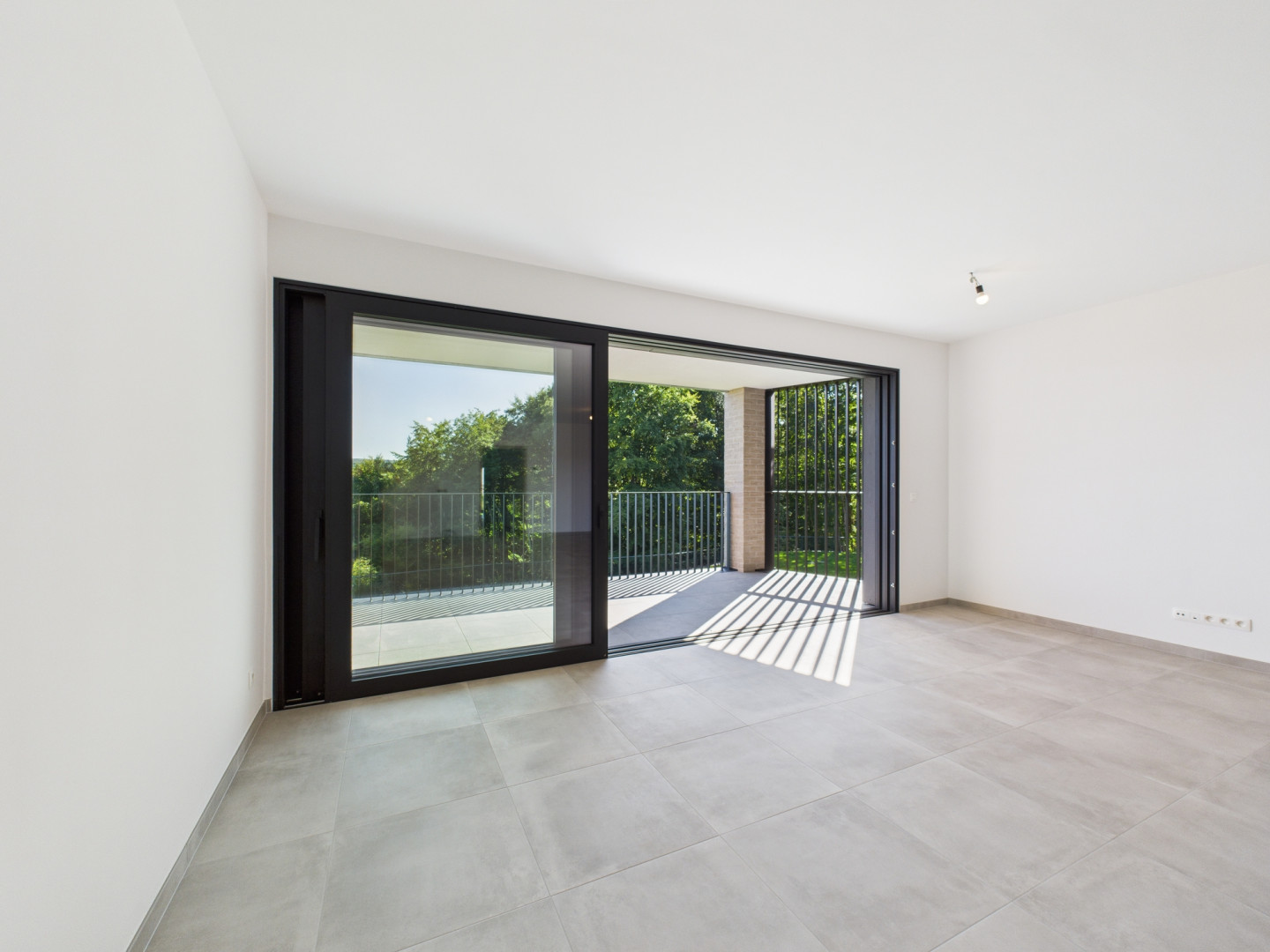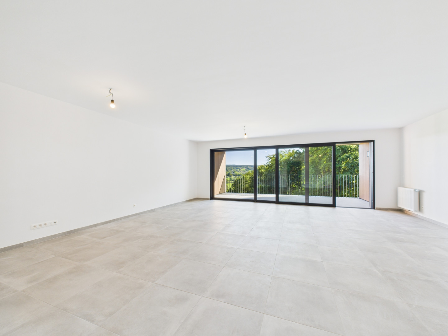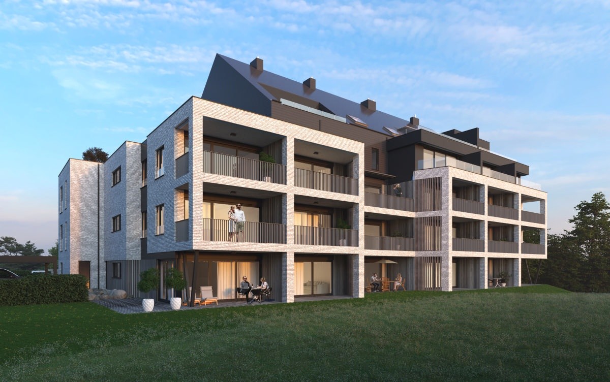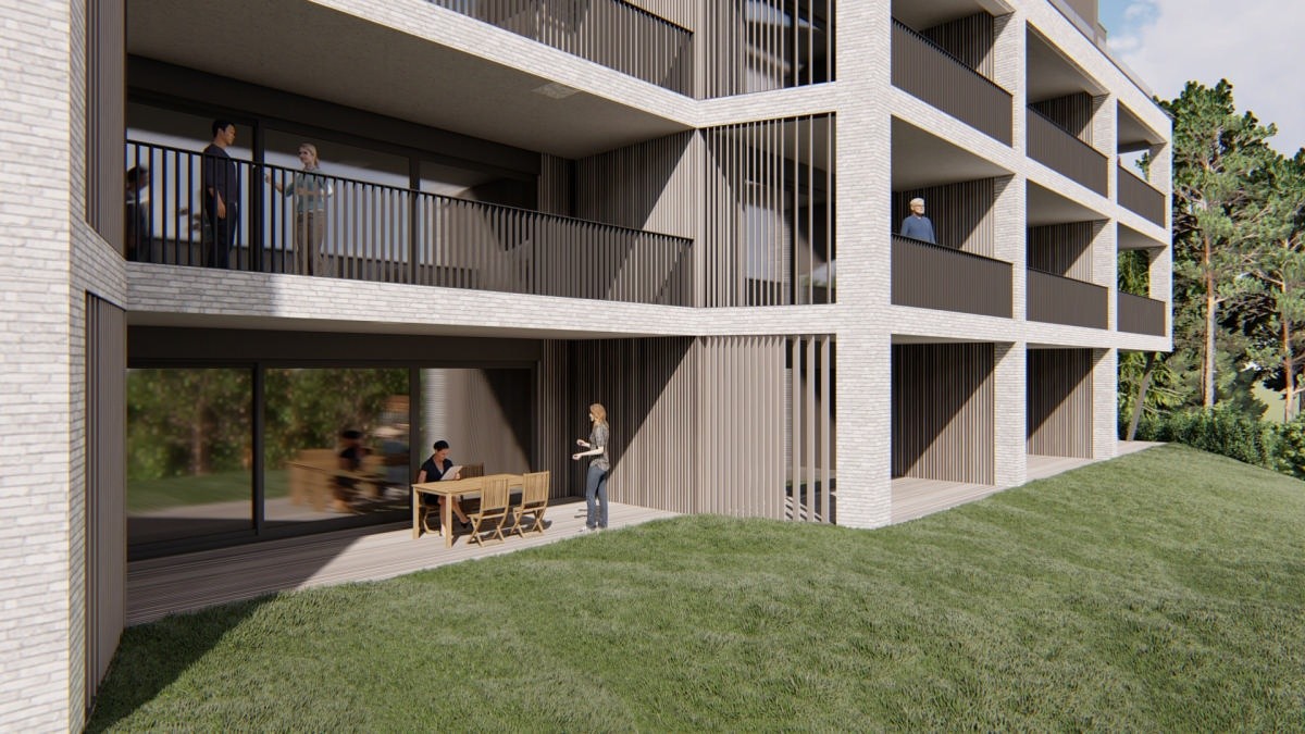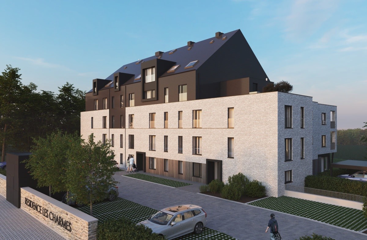 Voici un des appartements du 1er étage. La terrasse, exposée Sud, fait 12 m2 et offre une très jolie vue. Tous les compteurs sont séparés et certains appartements bénéficient de panneaux photovoltaïques. Le prix inclus la pose de revêtement de sol en Quick Step dans les chambres et les peintures (murs et plafonds en blanc). Les prix s'étendent hors frais (parking, cave,...)