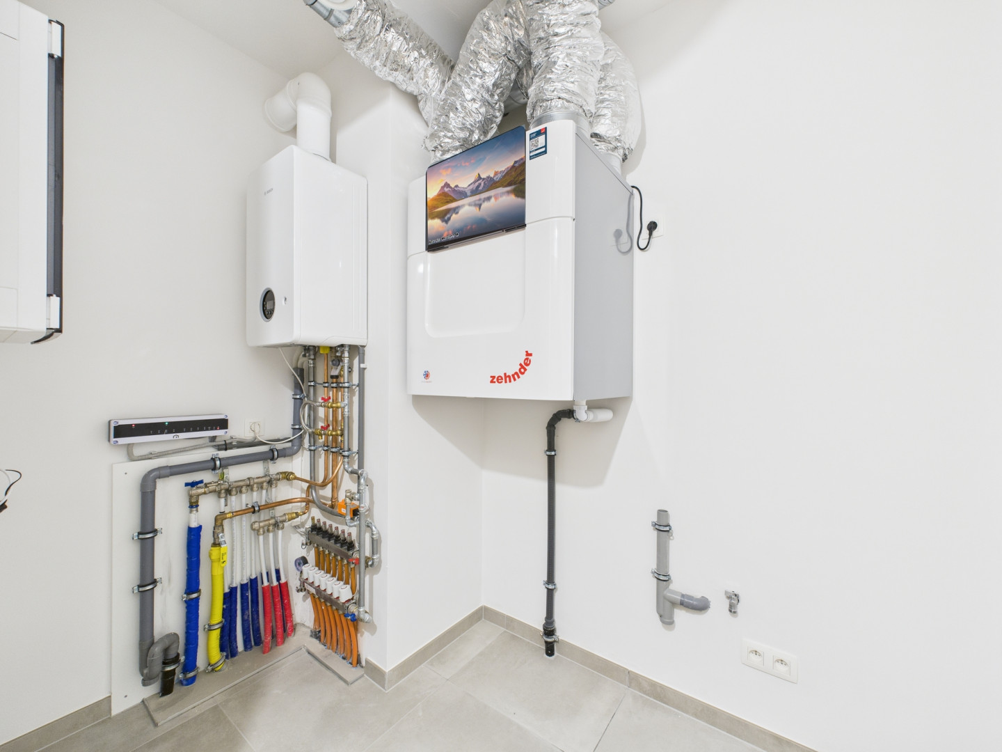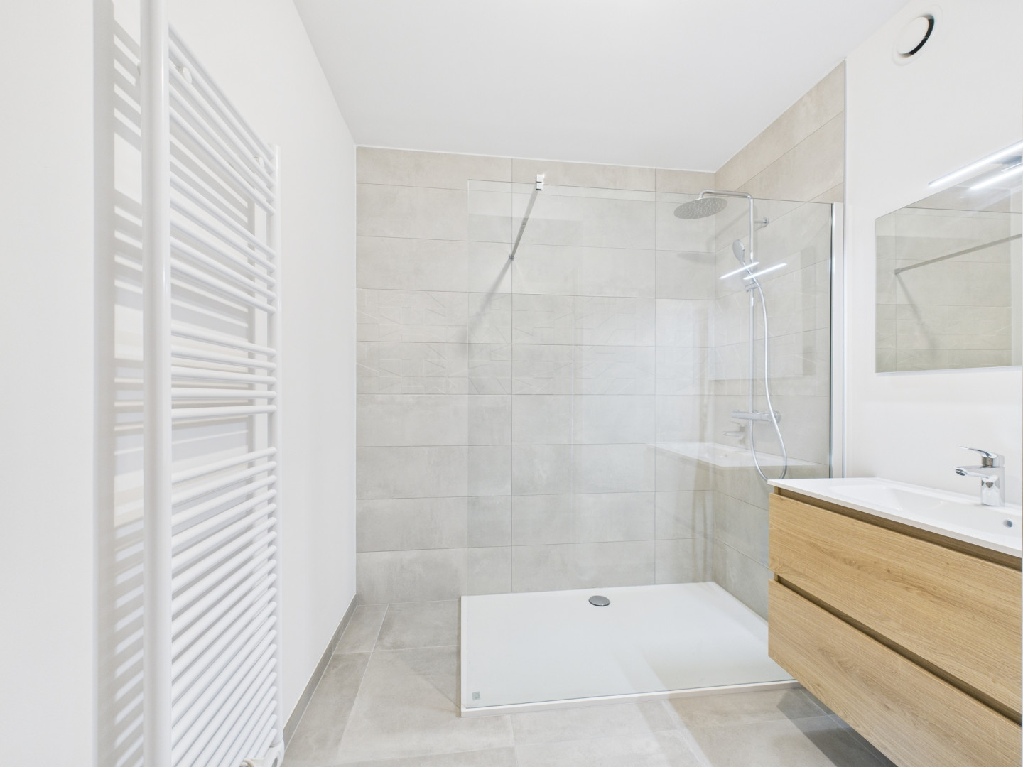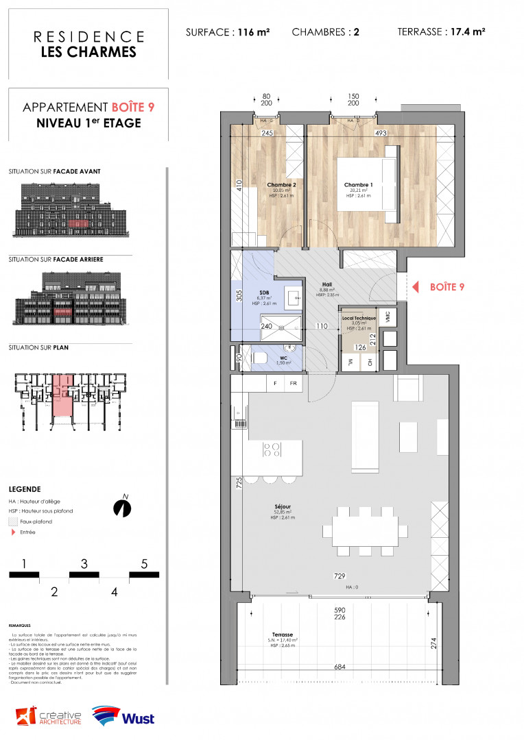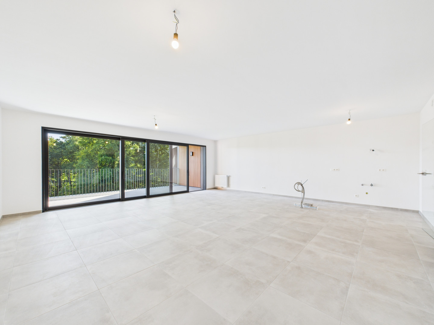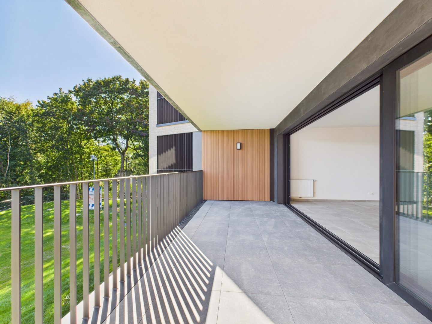 Voici un des appartements du 1er étage. La terrasse, exposée Sud, fait 12 m2 et offre une très jolie vue. Tous les compteurs sont séparés et certains appartements bénéficient de panneaux photovoltaïques. Le prix inclus la pose de revêtement de sol en Quick Step dans les chambres et les peintures (murs et plafonds en blanc). Les prix s'étendent hors frais (parking, cave,...)