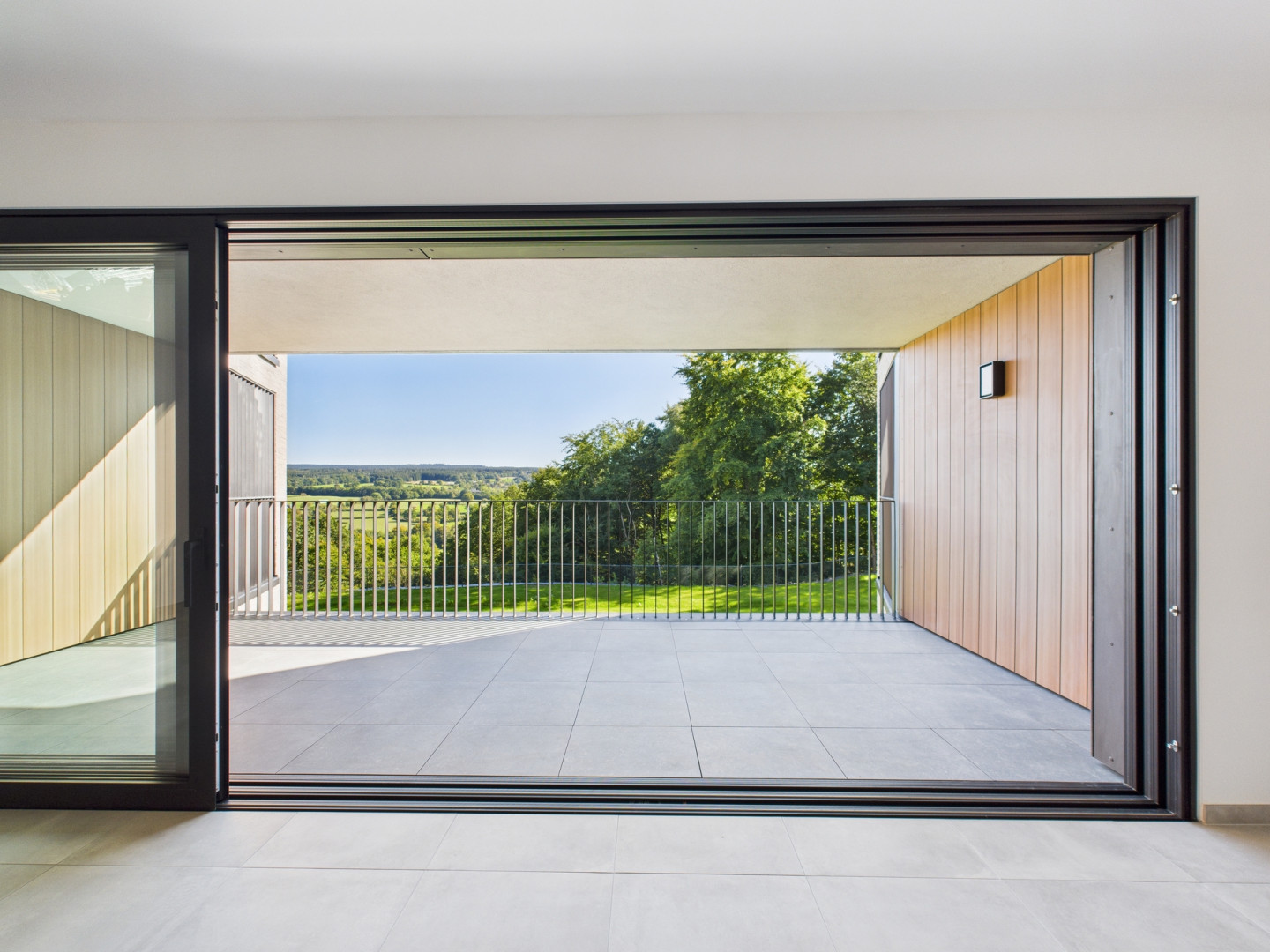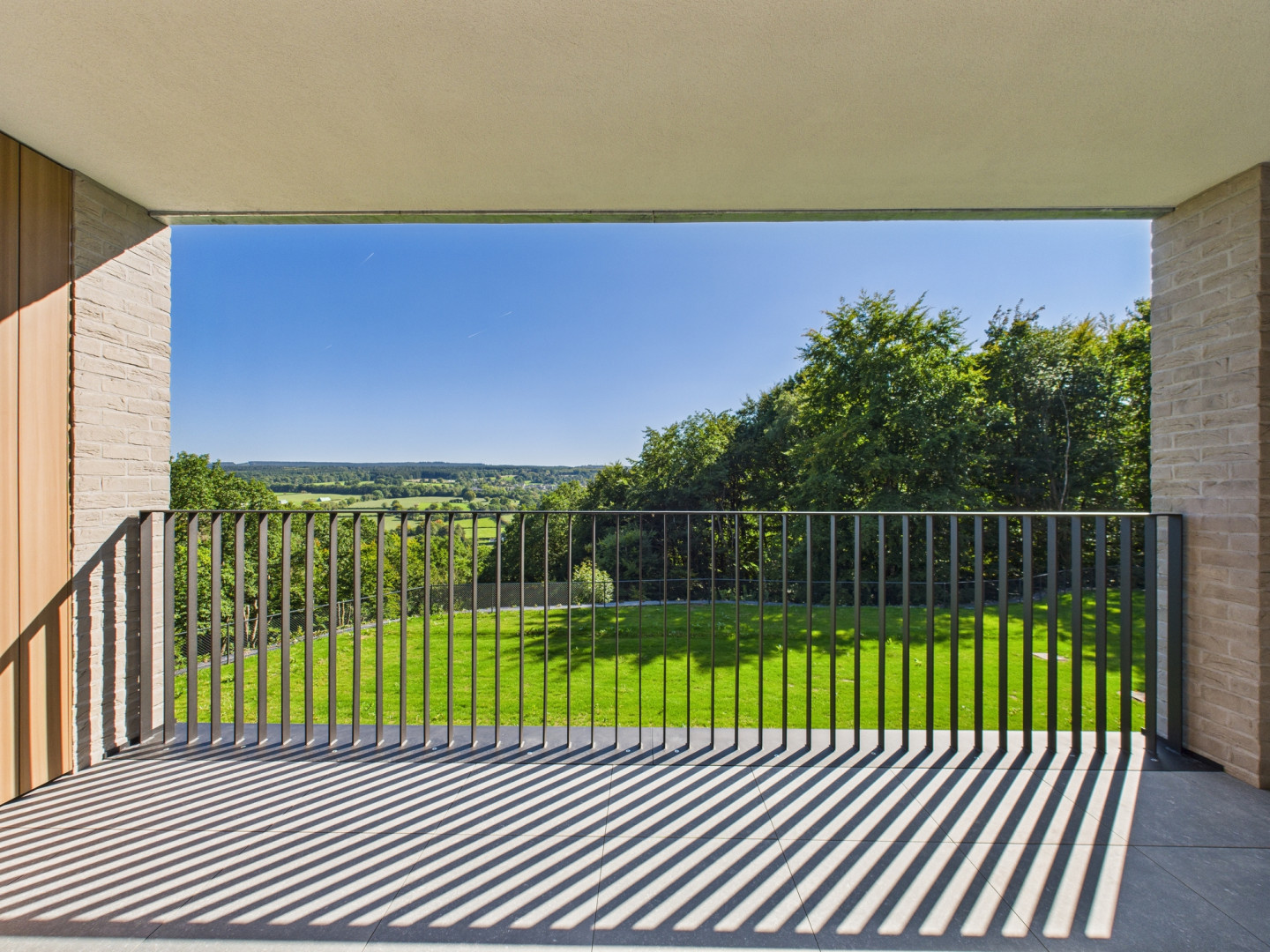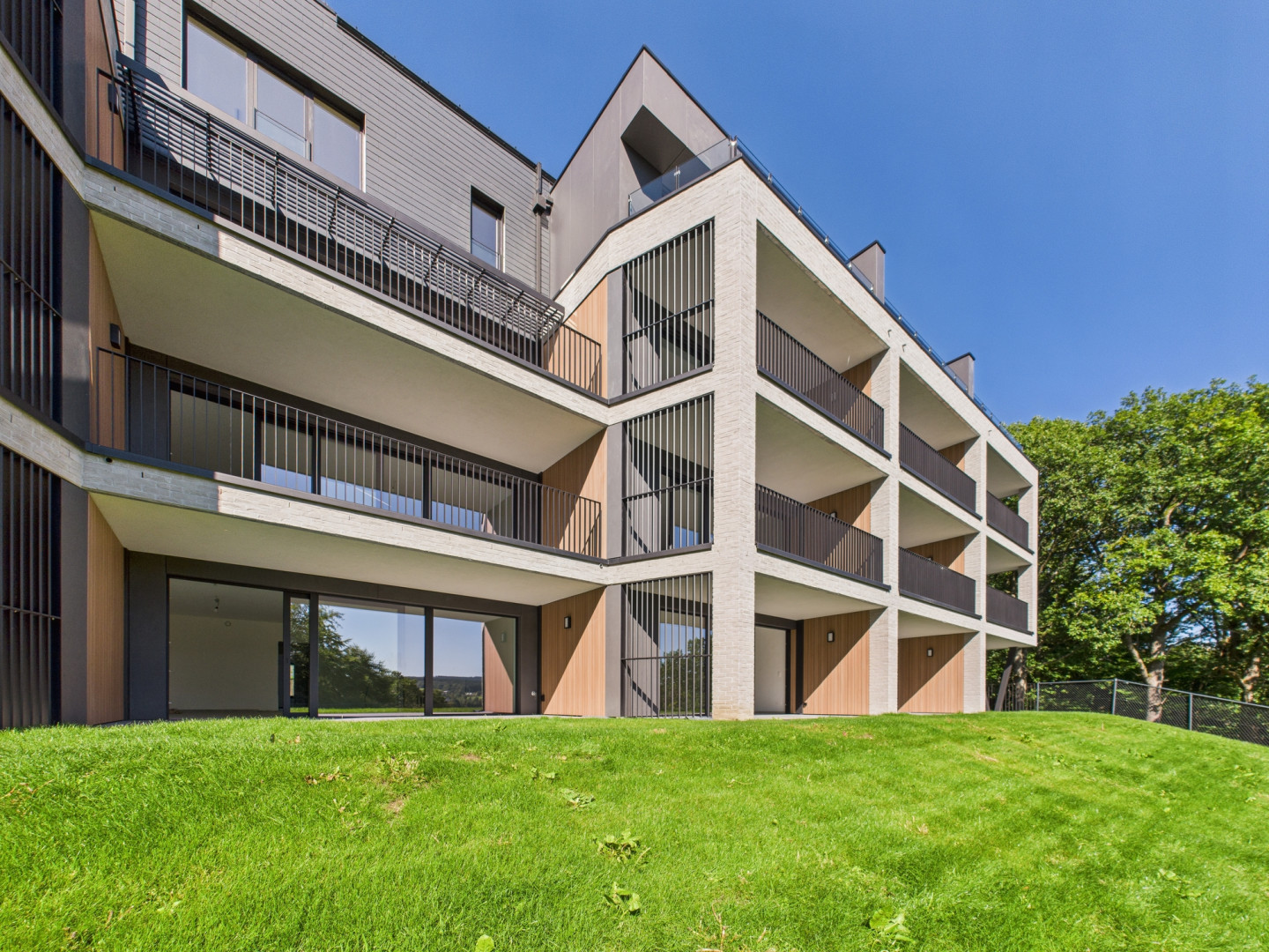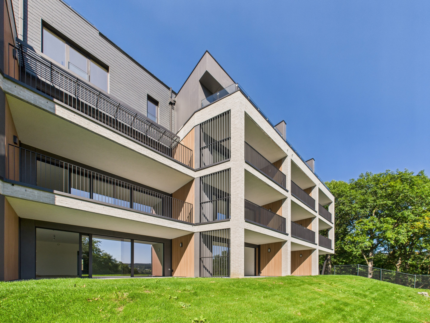 Voici un des appartements du 2ème étage, le 2.4. La terrasse, exposée Sud, fait 12 m2 et offre une très jolie vue. Tous les compteurs sont séparés et certains appartements bénéficient de panneaux photovoltaïques. De grandes baies vitrées offre un joli coup d'oeil sur le jardin et la Fagne. Jetez un oeil au plan de cet appartement.