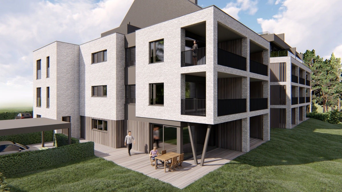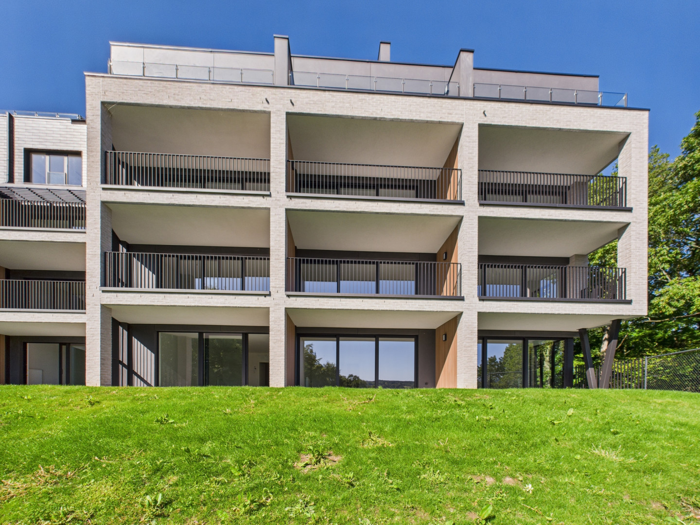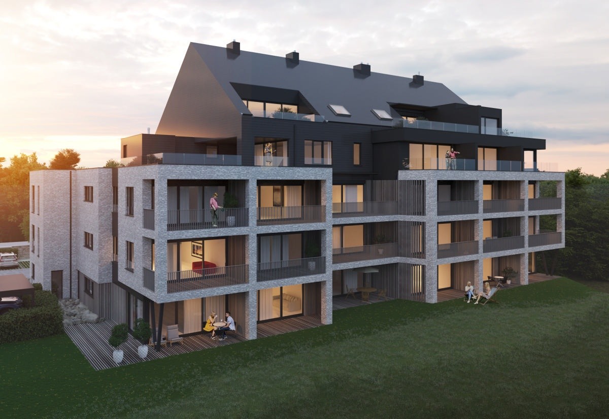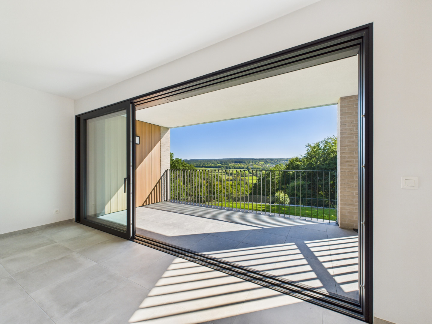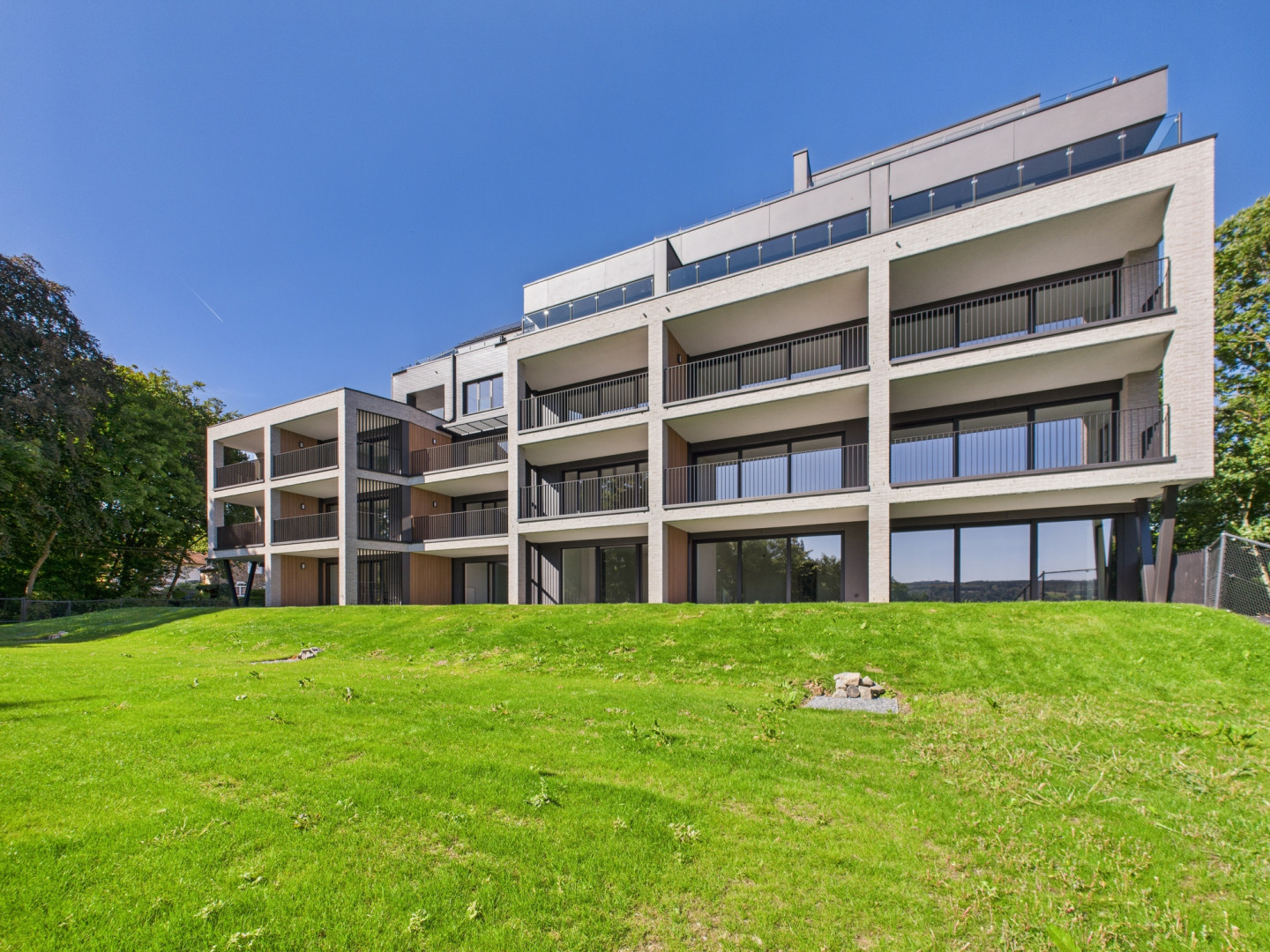 Voici un des appartements du 2ème étage, le 2.4. La terrasse, exposée Sud, fait 12 m2 et offre une très jolie vue. Tous les compteurs sont séparés et certains appartements bénéficient de panneaux photovoltaïques. De grandes baies vitrées offre un joli coup d'oeil sur le jardin et la Fagne. Jetez un oeil au plan de cet appartement.