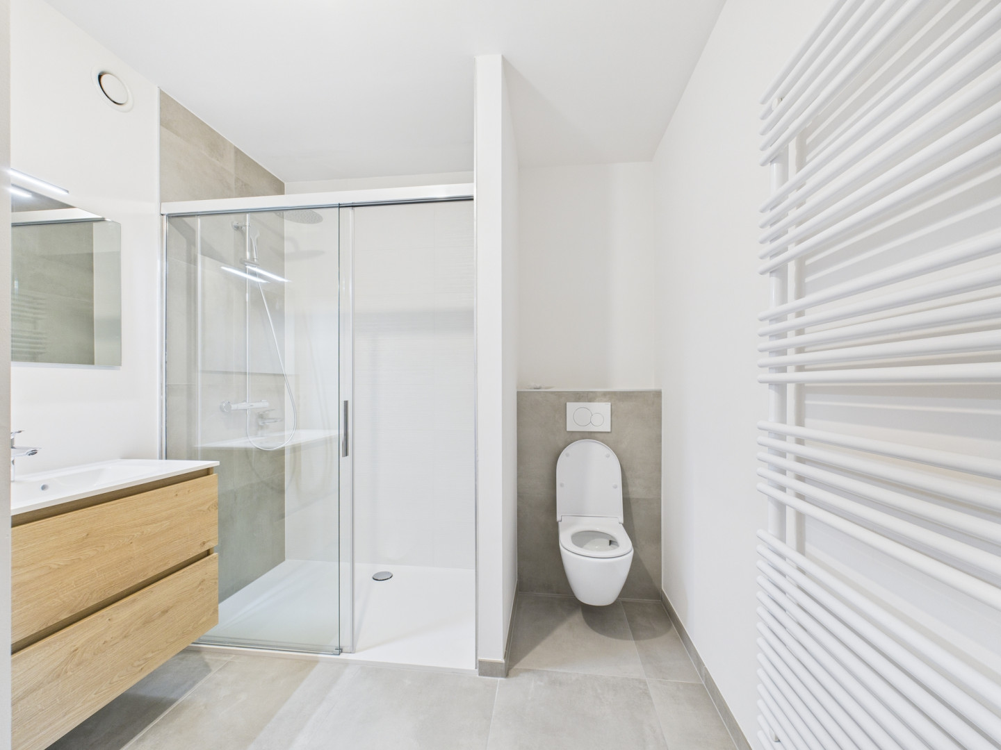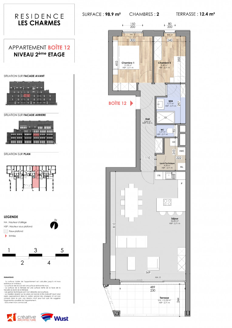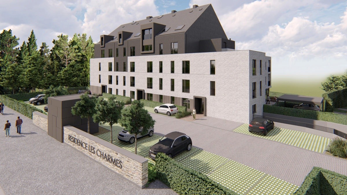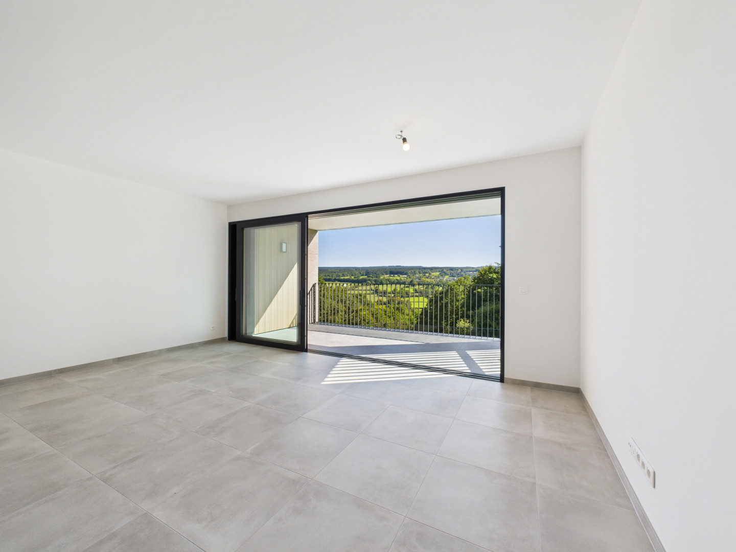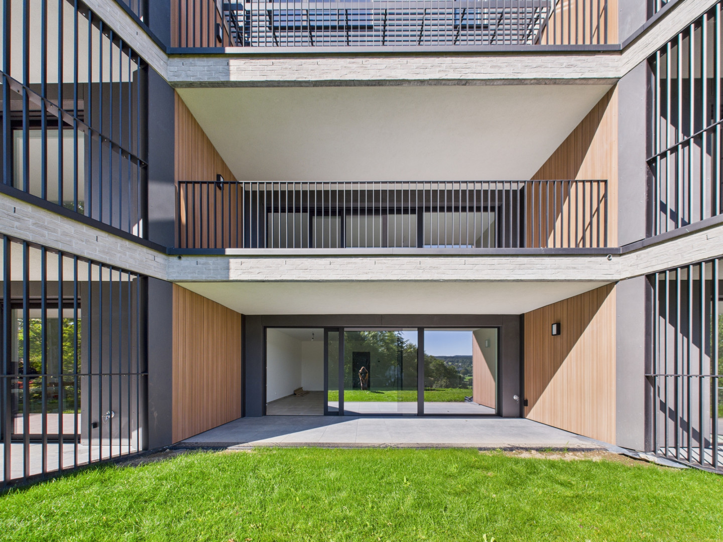 Voici un des appartements du 2ème étage, le 2.4. La terrasse, exposée Sud, fait 12 m2 et offre une très jolie vue. Tous les compteurs sont séparés et certains appartements bénéficient de panneaux photovoltaïques. De grandes baies vitrées offre un joli coup d'oeil sur le jardin et la Fagne. Jetez un oeil au plan de cet appartement.