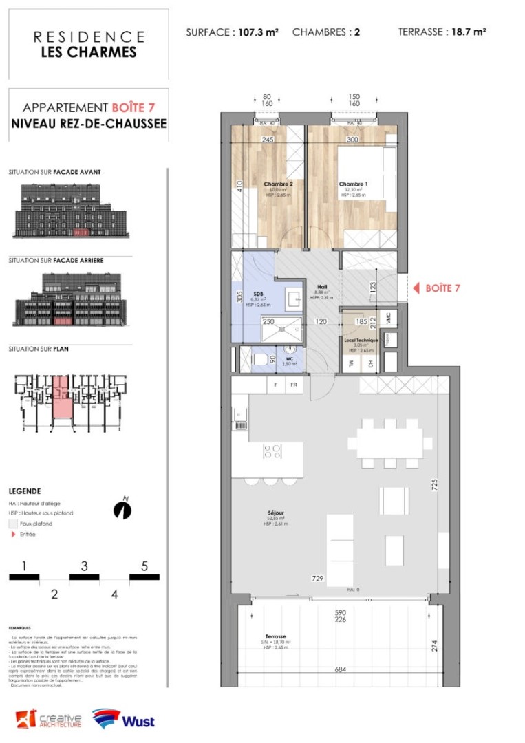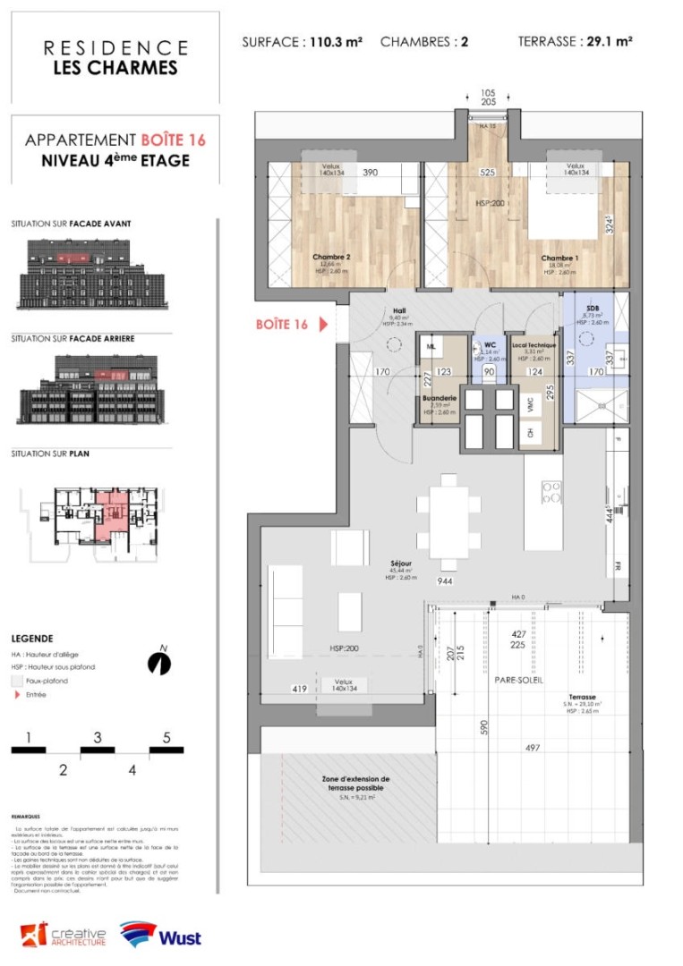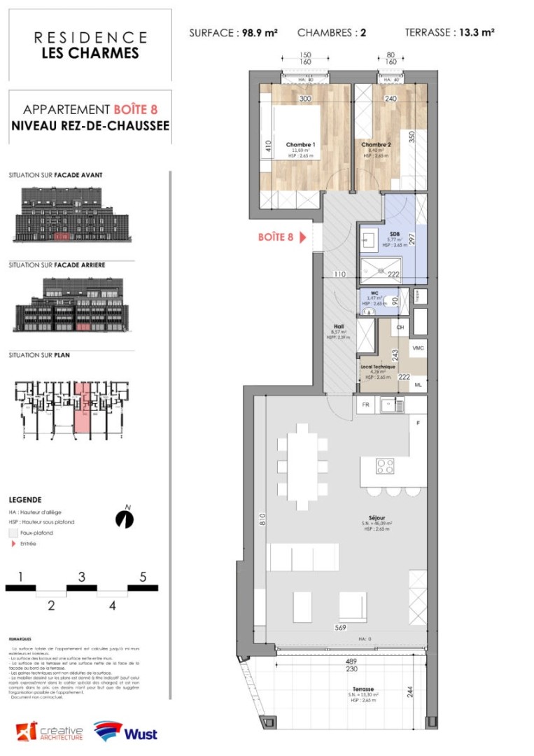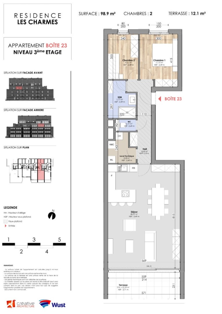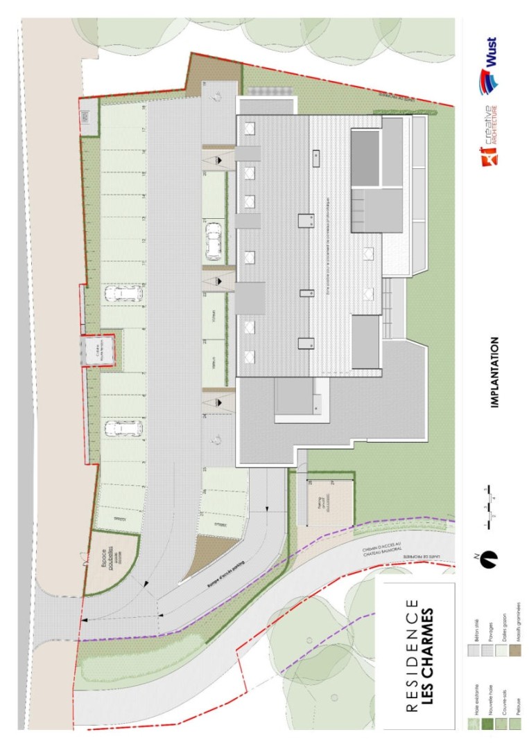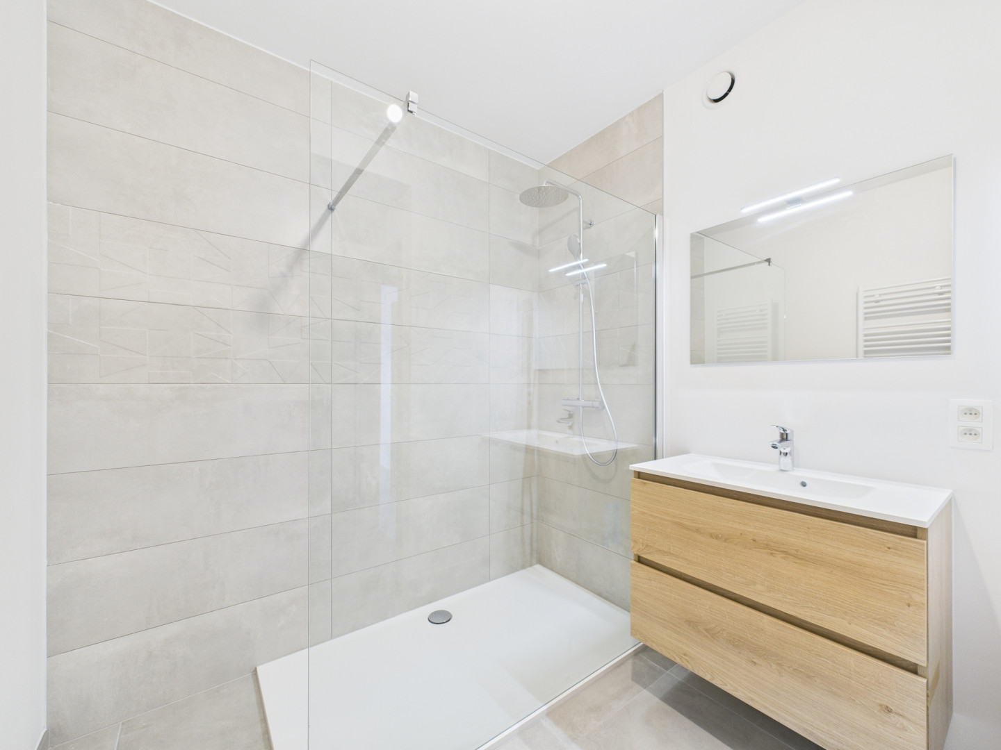 Voici un des appartements du 2ème étage, le 2.4. La terrasse, exposée Sud, fait 12 m2 et offre une très jolie vue. Tous les compteurs sont séparés et certains appartements bénéficient de panneaux photovoltaïques. De grandes baies vitrées offre un joli coup d'oeil sur le jardin et la Fagne. Jetez un oeil au plan de cet appartement.