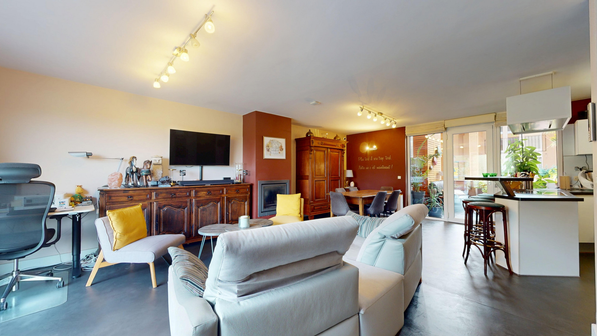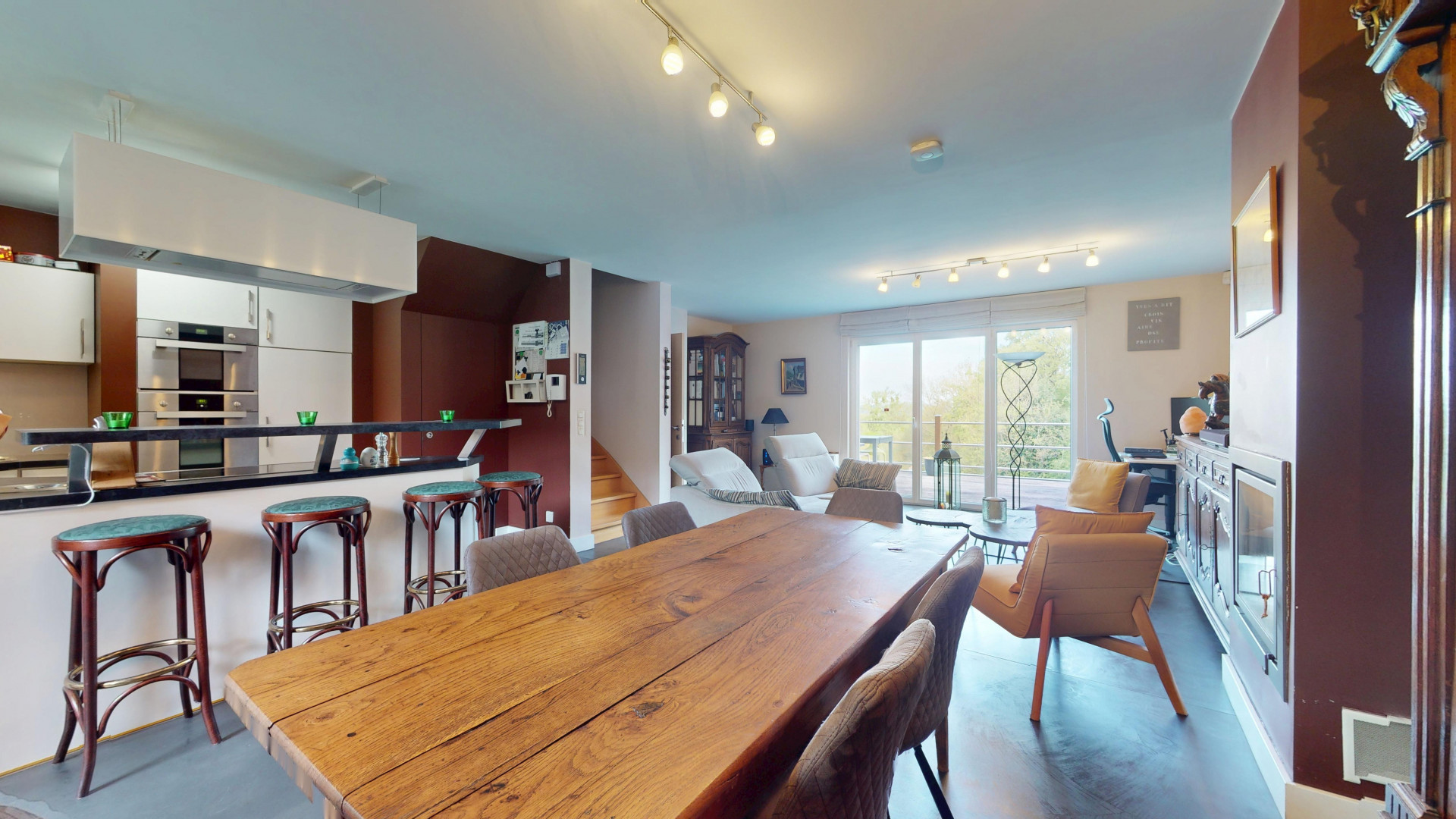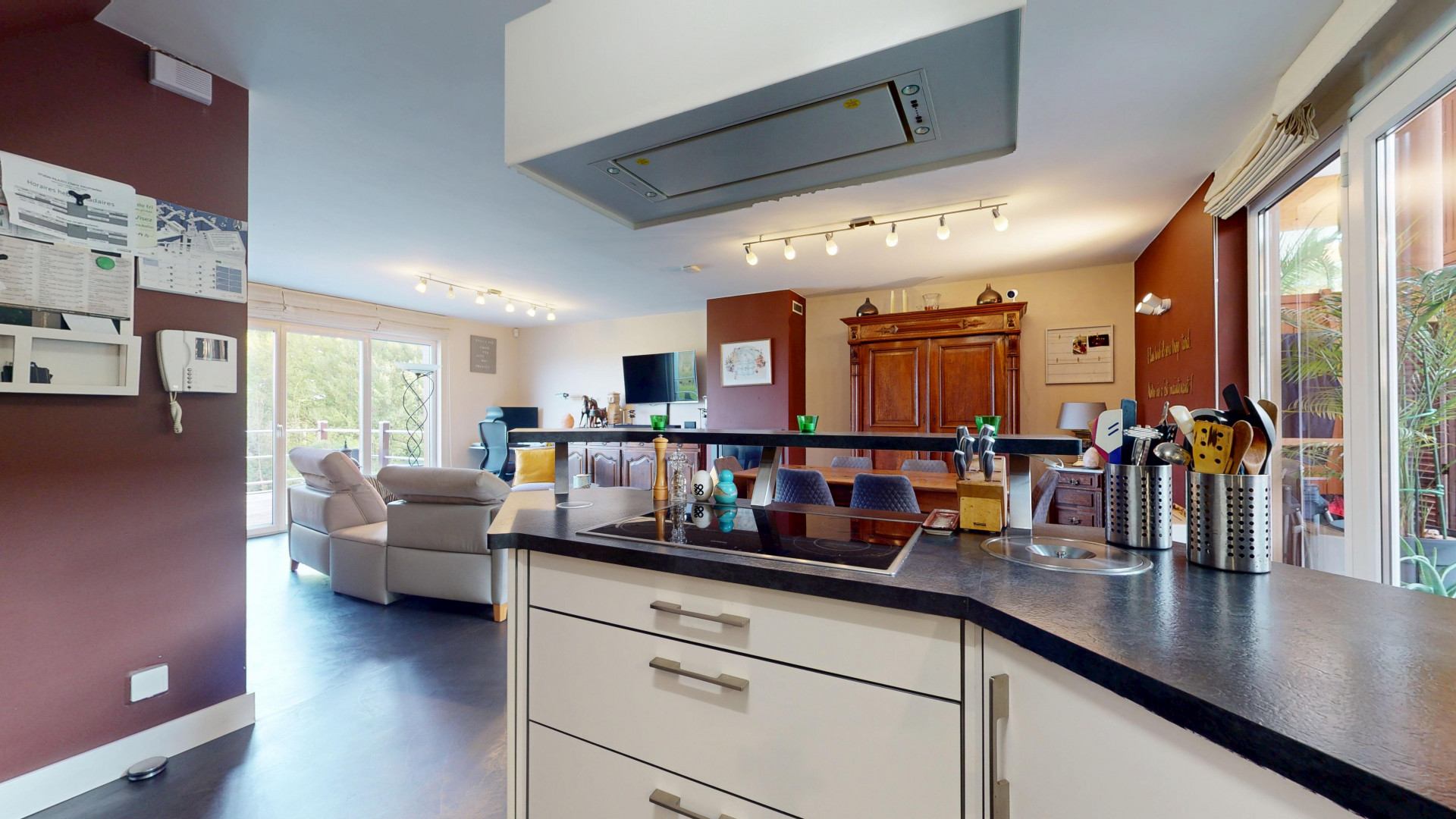 Un vaste séjour baigné de lumière avec cuisine équipée ouverte, idéal pour recevoir en toute convivialité